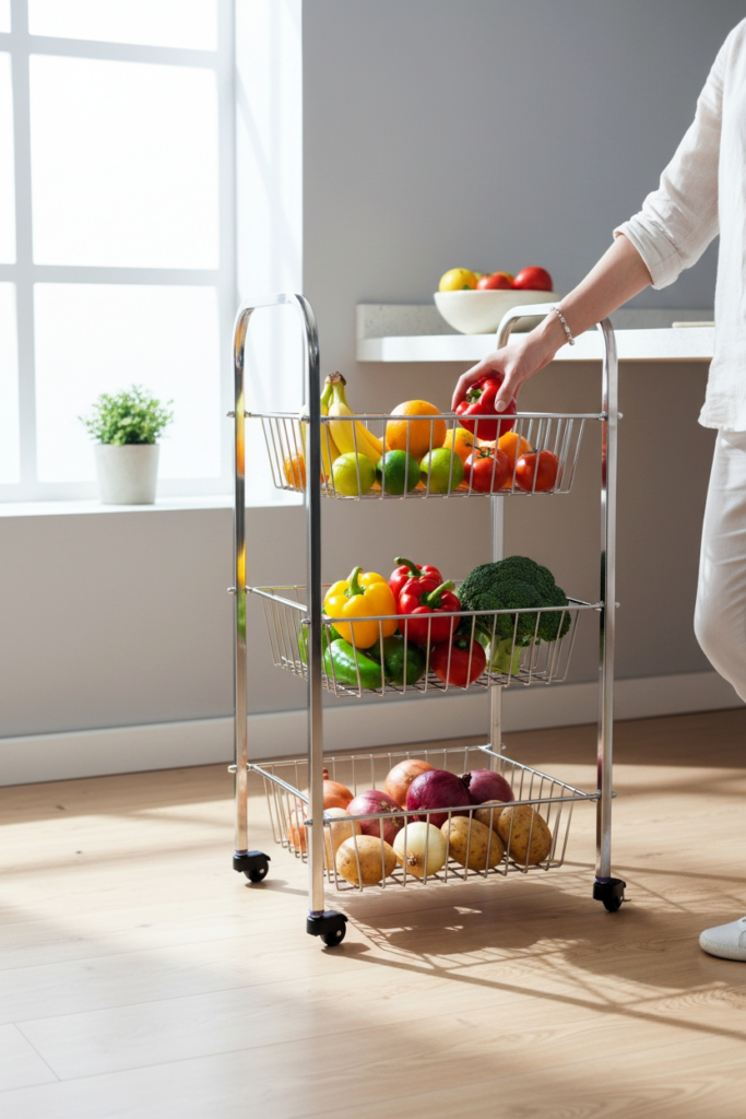 Indian cooking involves frequent use of fresh vegetables, multiple ingredients, and daily grocery storage. The Amol kitchen trolley caters perfectly to these needs by providing organized, visible, and easily accessible storage. Keeping vegetables and essentials in separate tiers helps reduce clutter on countertops and inside cabinets, improving workflow and efficiency during cooking. The trolley’s ventilated design also makes it suitable for storing onions and potatoes, which require airflow to stay fresh.