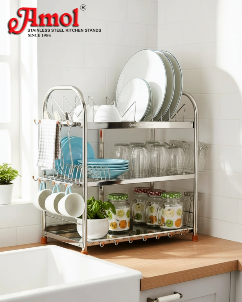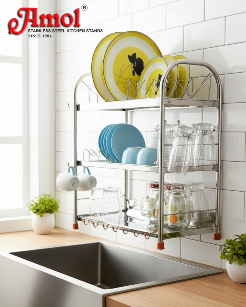 The AMOL® 3-tier dish rack is perfect for small families, working professionals, students in hostels/PGs and anyone who cooks daily. It suits modular kitchens, compact flats, rental homes and commercial kitchen counters where space optimization and hygiene are top priorities. Small restaurants and tiffin services can also use it to keep frequent-use items organized and ready.